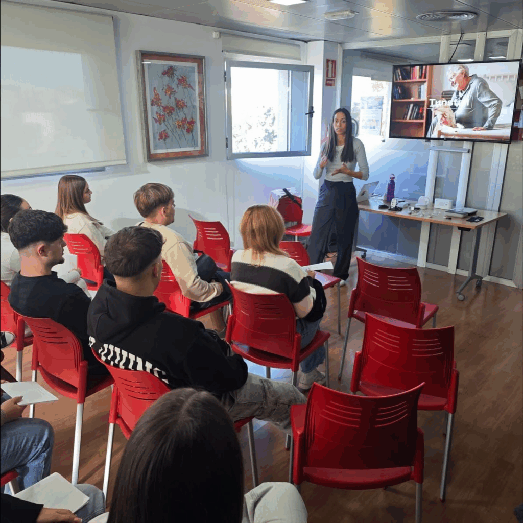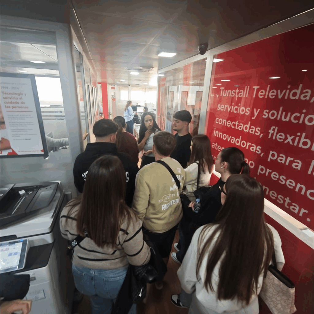 Primera parada: Tunstall Televida. Les recibió Ana, trabajadora social, y les explicó de forma muy clara cómo funciona la teleasistencia: un servicio que te atiende 24/7, que combina tecnología + trato humano para que miles de personas mayores o en situación de dependencia vivan más seguras en casa. Verlo por dentro ayuda a entender la coordinación, los recordatorios, el acompañamiento y la movilización de recursos cuando hace falta.