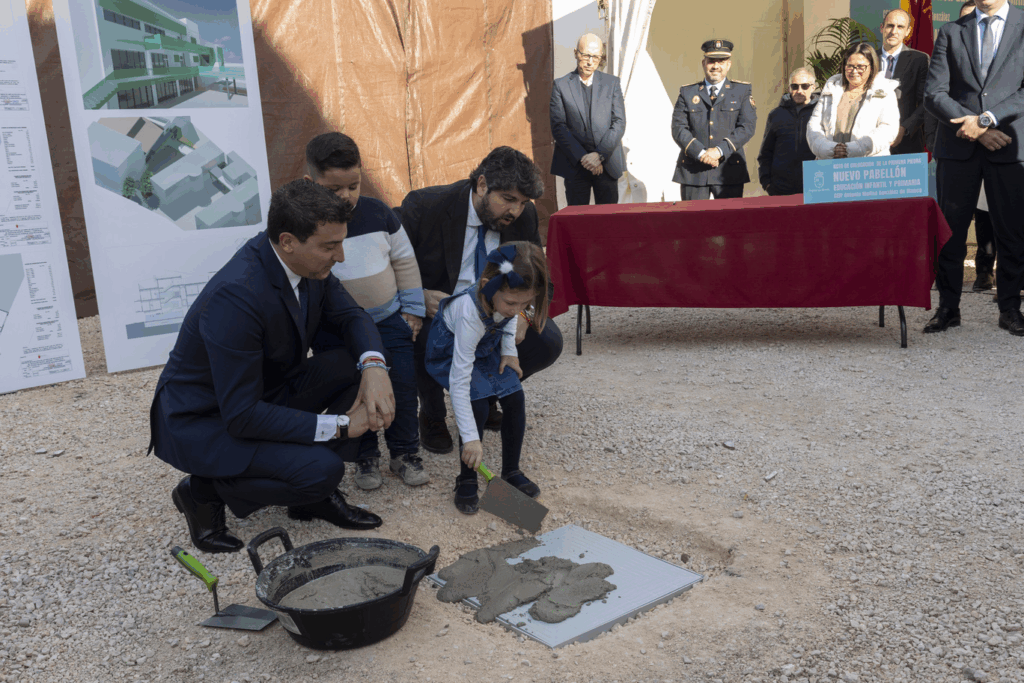El jefe del Ejecutivo autonómico, Fernando López Miras, y el alcalde del Consistorio, Á. Pablo Cano, han colocado hoy la primera piedra del nuevo pabellón que contará con seis aulas de Infantil, comedor y gimnasio y una inversión que supera los tres millones de euros.