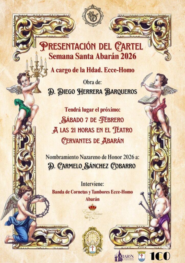 La Junta de Hermandades ha distribuido el anuncio de la presentación del Cartel Semana Santa Abarán 2026, obra de D. Diego Herrera Barqueros que tendrá lugar el 7 de febrero de 2026 en el Teatro Cervantes a las 21 horas.