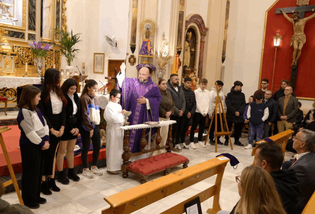 La ceremonia religiosa, oficiada por el párroco D. Miguel Ángel, también sirvió para dar la bienvenida oficial a los nuevos integrantes de la familia cofrade, quienes recibieron los escudos que lucirán en sus túnicas durante la procesión.