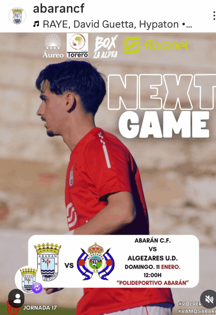 El Abarán CF se enfrenta en jornada de domingo a las 12:00 horas en el Polideportivo Municipal de Abarán contra el Algezares CF. El Abarán que se encuentra en el puesto 14 a 7 puntos del descenso, del antepenultimo equipo de la tabla que es el Beniel y con un partido menos por la suspensión de su partido en casa frente al Bullense, el pasado 14 de diciembre por el mal tiempo. Una victoria que le permitiría pasar al Algezares en la tabla y al Lorca Deportiva B si no vence en casa a uno de los gallitos de la categoría, el Alcantarilla FC. Una victoria le permitiría ascender dos puestos, si el Lorca no gana y situarse en la parte media de la tabla que le permita mirar hacia los puestos de arriba. Las nuevas directrices del entrenador Mapeka y nuevos refuerzos mantienen al aficionado conectado con el equipo.