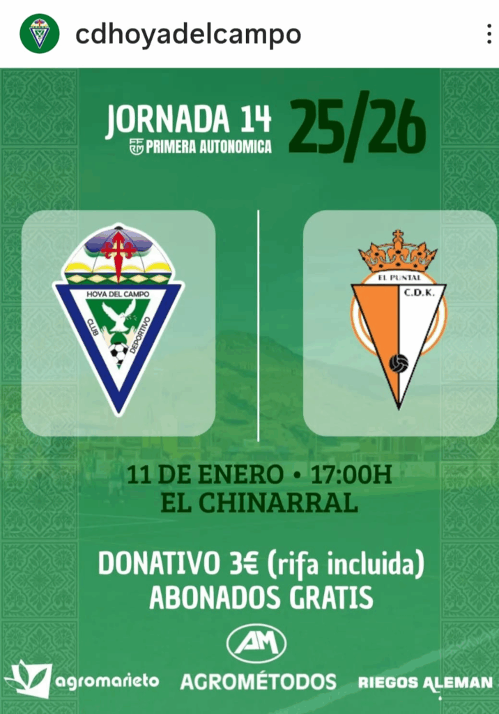 Otro duelo en la cumbre es el que vamos a ver en primera autonómica entre el Club Deportivo Hoya del Campo y El Puntal, primero y tercero en la jornada 13 con 32 y 27 puntos respectivamente y que de ganar «los verdes» de la Hoya, pondrían tierra de por medio con este equipo de El Puntal. Tendremos oportunidad de ver en el campo del Chinarral al «Matador» Panadero, tercer máximo goleador de la categoría y que está en un gran momento de forma.