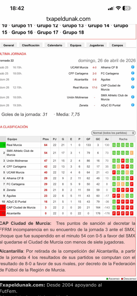 El 17-0 ha sido el resultado de hoy contra el CAP de Murcia. Hemos quedado campeonas del grupo de Murcia, además de entre las 18 campeonas de grupo de toda España hemos sido las que más puntos y goles han conseguido, por eso ascendemos directamente si pasar por los play off, solo había una plaza de ascenso directo en toda España.