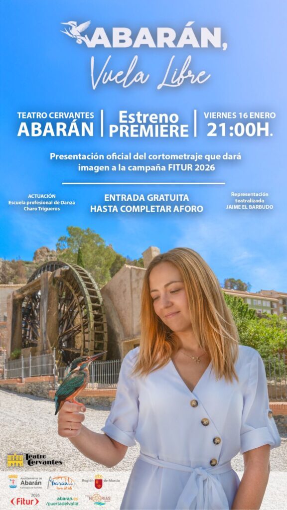 El viernes 16 de enero, el Teatro Cervantes, que en 2026 celebra sus 100 años de historia, será escenario de un acontecimiento turístico-cultural único: la presentación del documental–cuento “Abarán, vuela libre”, una obra audiovisual que transporta al espectador por los paisajes, la naturaleza y la esencia de Abarán desde una mirada poética, visual y profundamente emocional.