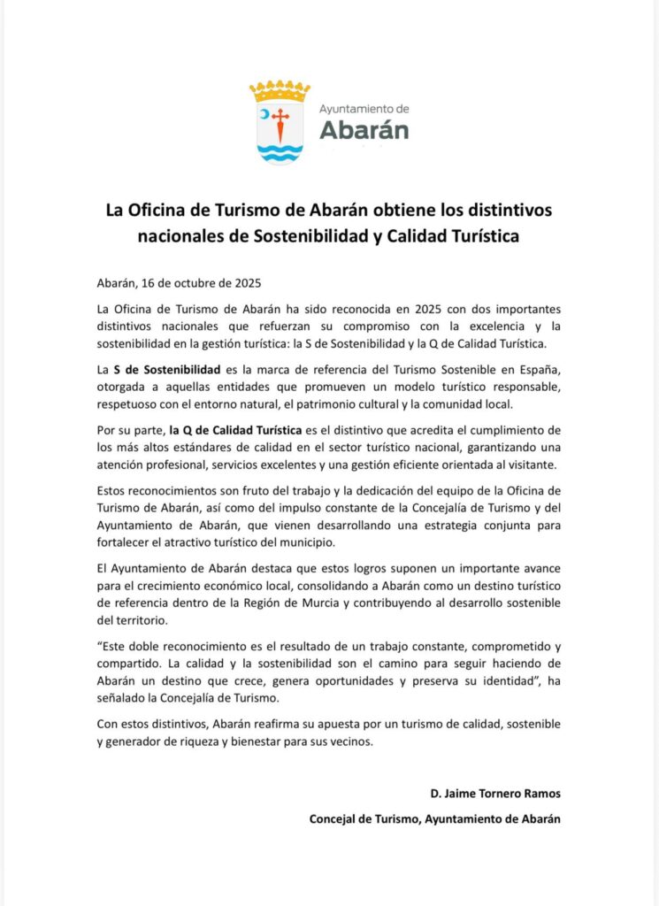 La Oficina de Turismo de Abarán ha sido reconocida en 2025 con dos importantes distintivos nacionales que refuerzan su compromiso con la excelencia y la sostenibilidad en la gestión turística: la S de Sostenibilidad y la Q de Calidad Turística.