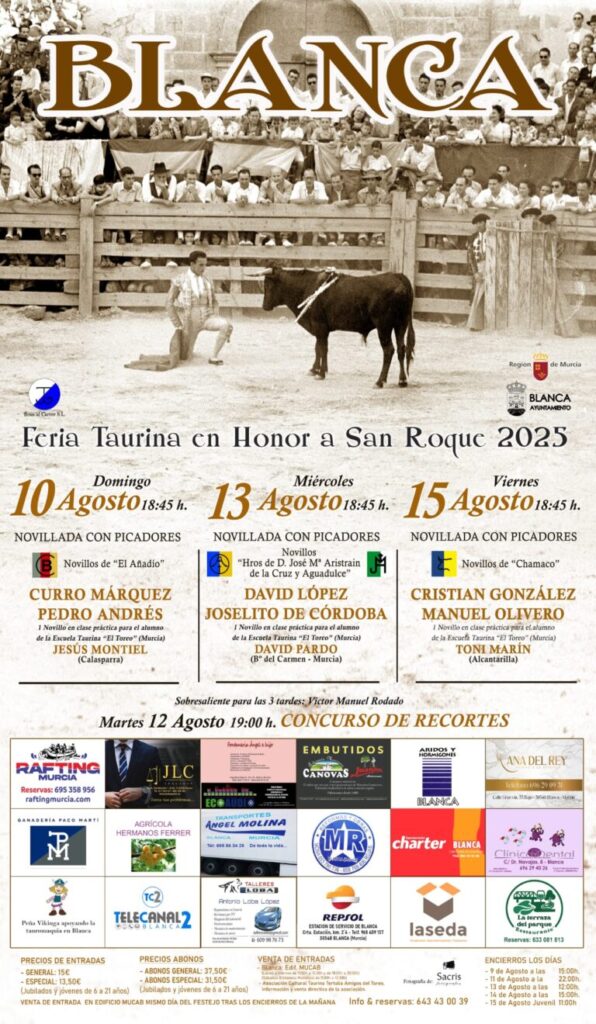 Esta edición la imagen del cartel anunciador es un homenaje al fotógrafo taurino de Blanca Ángel Molina Miñano ‘Sacris. Se trata de una imagen fechada en 1949.